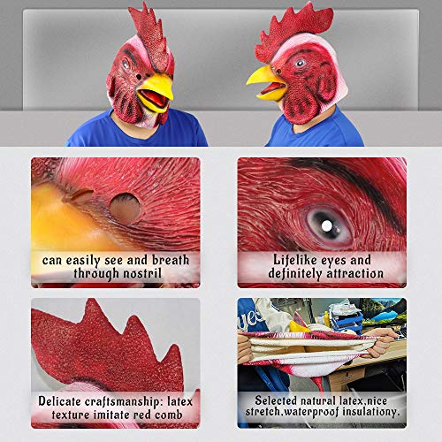 ★DETAILED & LIFELIKE ★ Thick rubber latex ,no worry deformed after using many times. Saturated color. Delicate craftsmanship: latex texture imitate red comb .You are definitely attraction wherever you take cock head mask