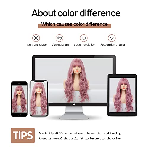 Specification: Esmee 26 Inches Long Pink Wig with Bangs Natural Synthetic Hair Wavy Wigs for Women Daily Party Cosplay Wear