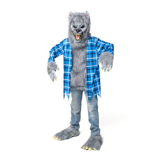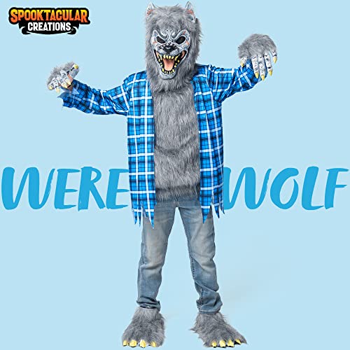 This Durable Grey Werewolf Costume includes Werewolf Mask, Torn Faux Fur Plaid Shirt, Gloves and Shoes Cover.